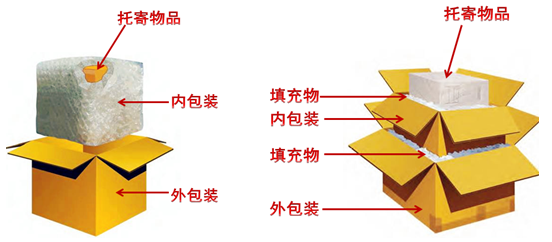 3.  易碎、易损物品包装法:外包装容器+内包装+填充物