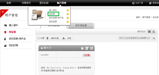 把鼠標指向「帳戶管理」,啟動清單後可選擇「個人資料」、「地址簿」、「修改密碼/用戶名」及「我的訂閱」